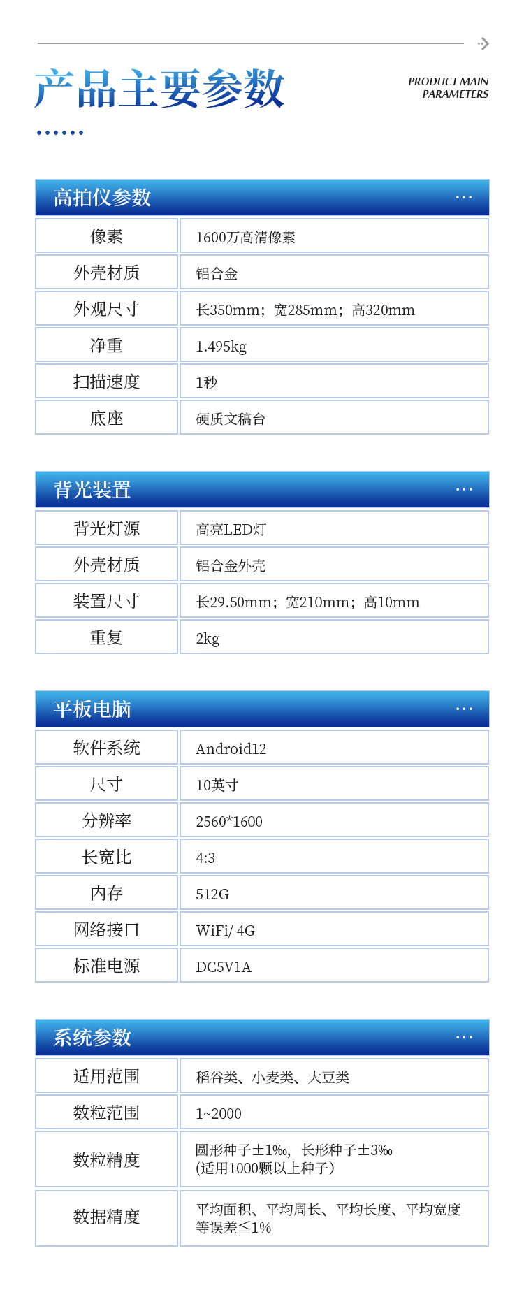智能考种系统可以测量各种表面光滑的籽粒的数量、千/百粒重与平均粒型(包括长、宽、长宽比、周长、面积),利用图像ORC 识别技术、图像定位、空间转换等技术实现快速识别种子数量及作物性状指标。